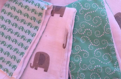 We offer hand painted burp cloths in sets of 3 for $18. They are the perfect size to protect your shoulder and super soft, as well as absorbant for the baby. We use non-toxic paint to embellish double guaze fabric for the top, and a solid color flannel for the bottom. There is a layer of cotton batting in between.